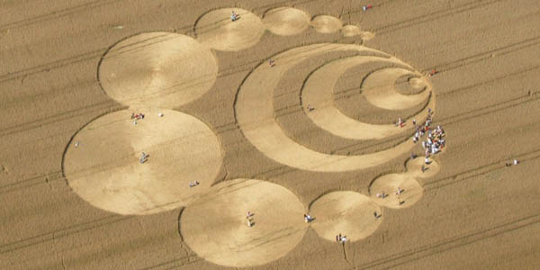 These are man-made formations of sometimes extraordinary geometric beauty and design. Over the years they have increased in complexity as the techniques used to create them have been refined. The use of computer software has aided in the overall ingenuity of these creations, but the actual tools used in flattening the crops are often as simple as a couple wood planks tethered to rope. Tractor lines are used to navigate through the crops to avoid disturbing areas not part of the intended design.