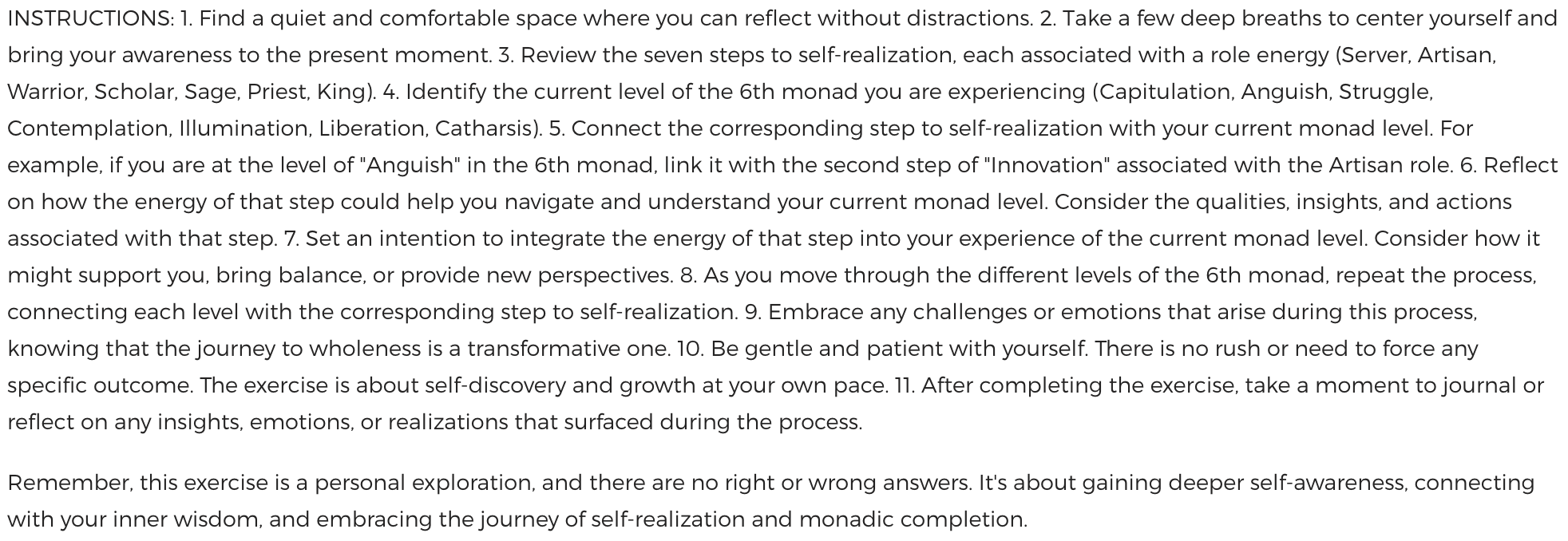 Remember that the internal monads are a series of life stages. They adhere to an established order for a reason. Each stage solidifies the commitment to the life plan, including any lessons derived from the experience. The progression serves as a mold for how the life is shaped. Each life has a beginning, a middle and an end, This framework of a story develops during the life and the monads act as turning points, adding necessary structure and an impetus to move the story forward to its conclusion. As every story has a beginning, there is also a culmination. The 7th monad serves as that culminating point.